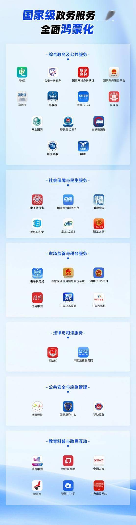 还有就是在政务民生应用方面,国家级政务及公共服务平台正在加速拥抱鸿蒙生态。目前已有国家医保服务平台、电子社保卡、民政通、国务院等超三十款服务全国的政务民生应用完成鸿蒙 5 适配并上架。全国还有近 400 款地方性政务应用已完成鸿蒙化适配并上架,涵盖政务服务、医保社保查询、公积金提取、医院挂号、户籍办理、企业服务等领域,标志着政务民生应用鸿蒙化已从“点”的突破迈向“面”的普及。