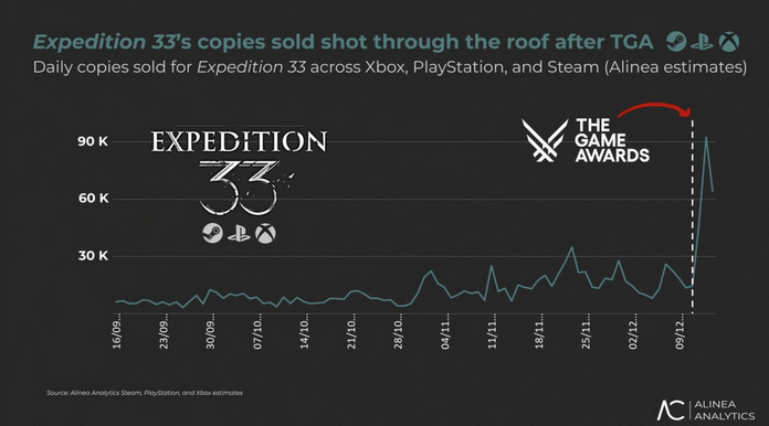 这一案例再次印证了 TGA 作为行业顶级盛会所具备的强大市场影响力。当作品同时获得最高奖项并形成广泛文化讨论时——正如去年的《博德之门3》《艾尔登法环》,以及今年的《33号远征队》——TGA 能发挥出显著的“奖项放大效应”,推动商业成绩迈上新台阶。