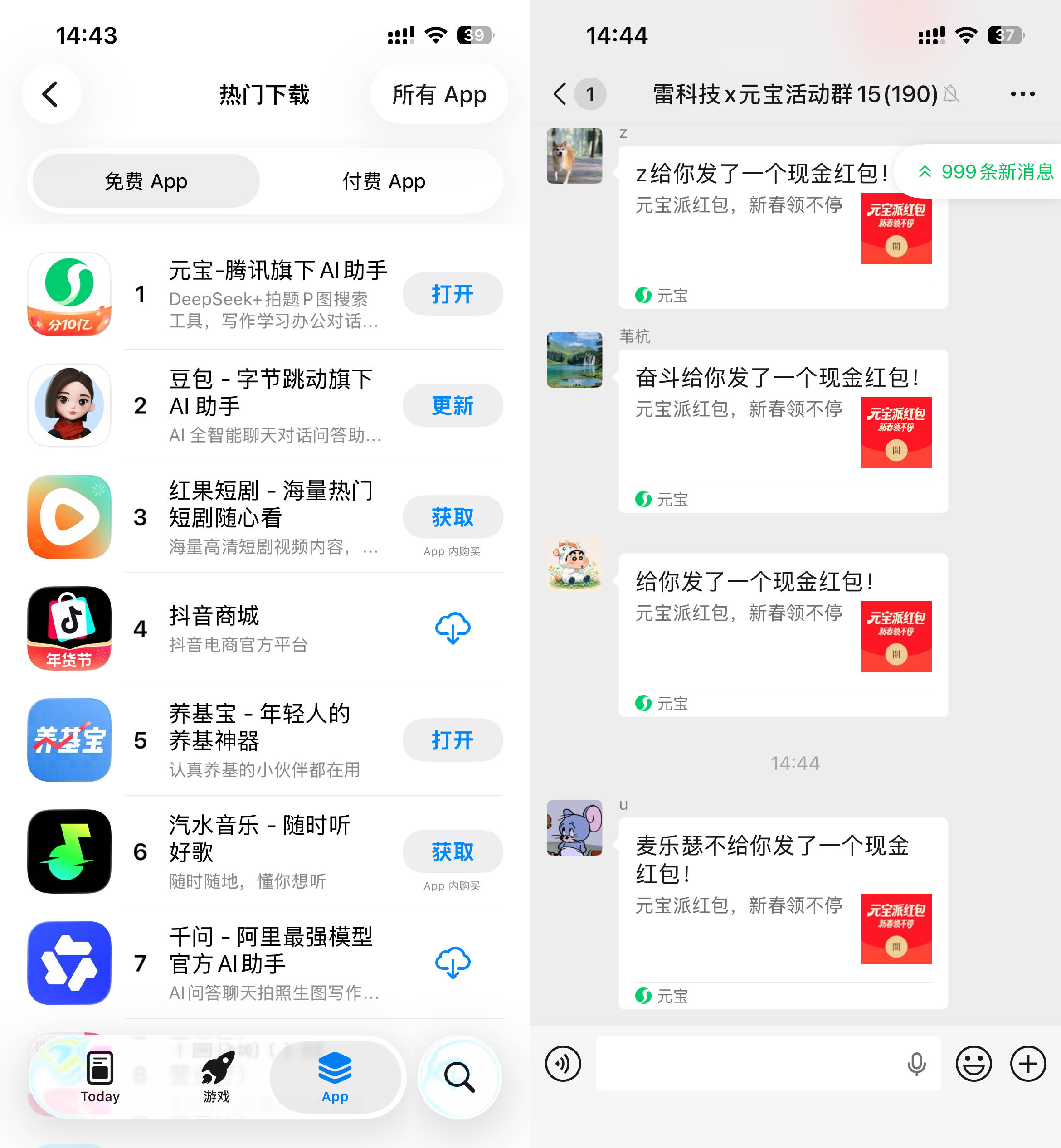 不过,其他大厂也没闲着。还记得前两天上线 亿春节红包不?整得那叫一个全网轰动啊。小雷每天两眼一睁,看到的不是微信好友发来的消息,而是群友那一条又一条的“xxx给你发了一个现金红包”。就这架势,堪比当年拼多多的砍一刀了。但不得不承认的是,这波流量赚到了,元宝 APP 的下载量也暴增。