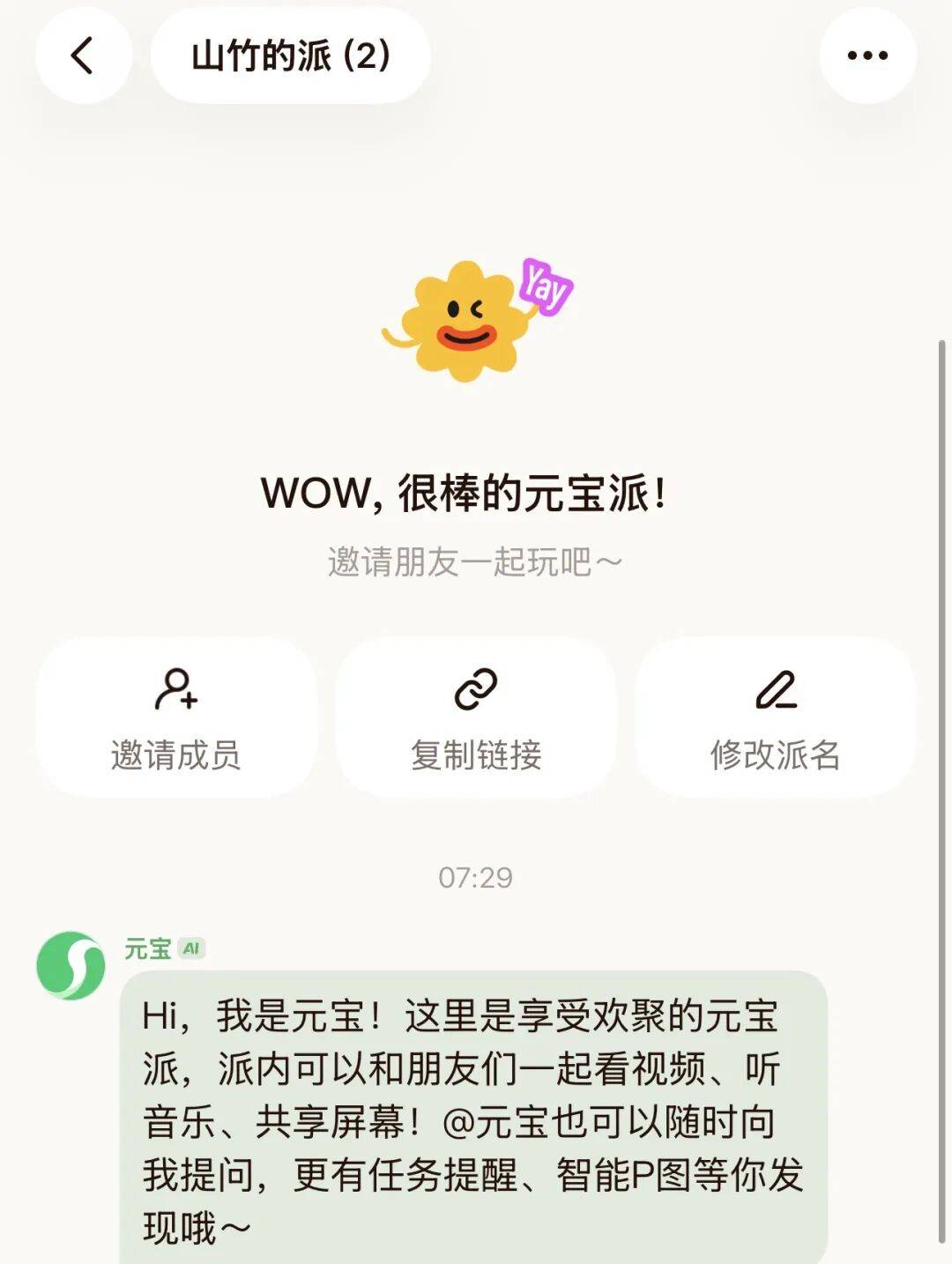 (此前在QQ里已经出现过这种模式),在元宝派里,元宝AI作为群聊好友,可以与用户聊天互动、P图二创、共享屏幕,并可以分享腾讯视频、等内容,用户可以与群里好友一起听音乐、看电影。