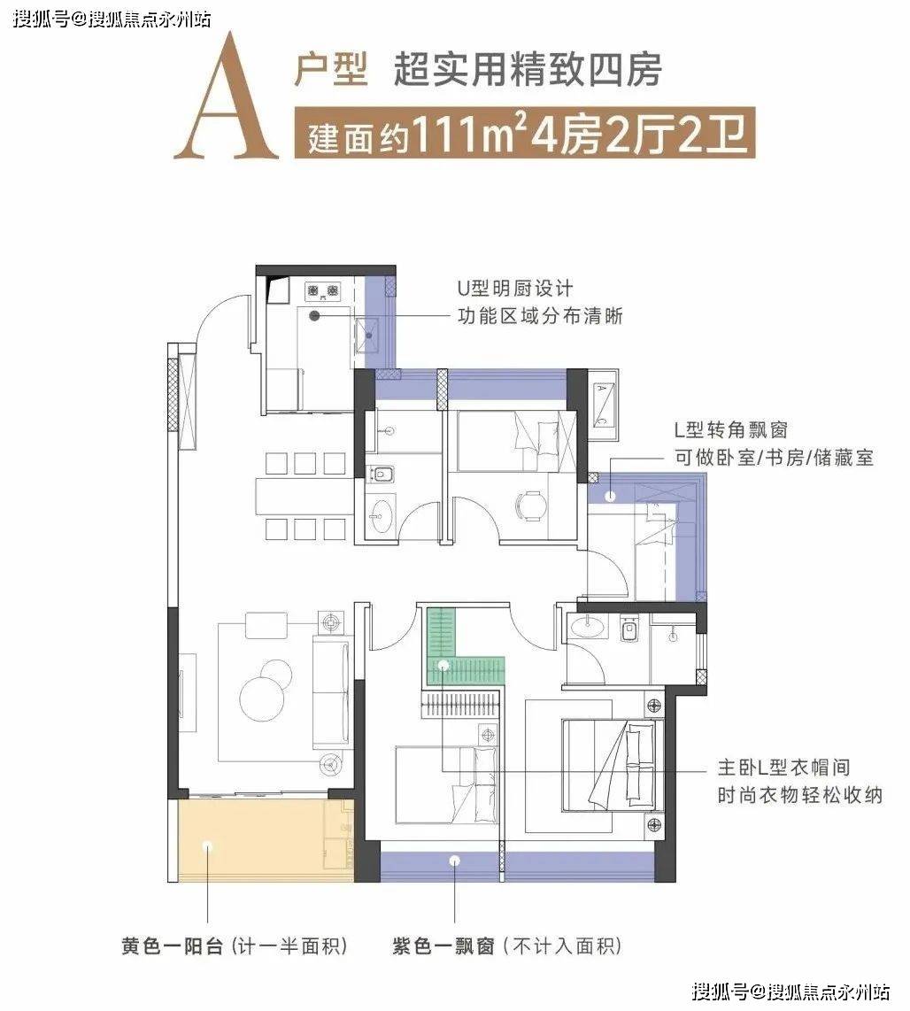 建面111㎡4房2厅2卫A户型:四房设计实用性强,动静分区明确,餐客厅一体,阳台开间宽敞。主卧套房设计,带卫生间和衣帽间,居住舒适度高。