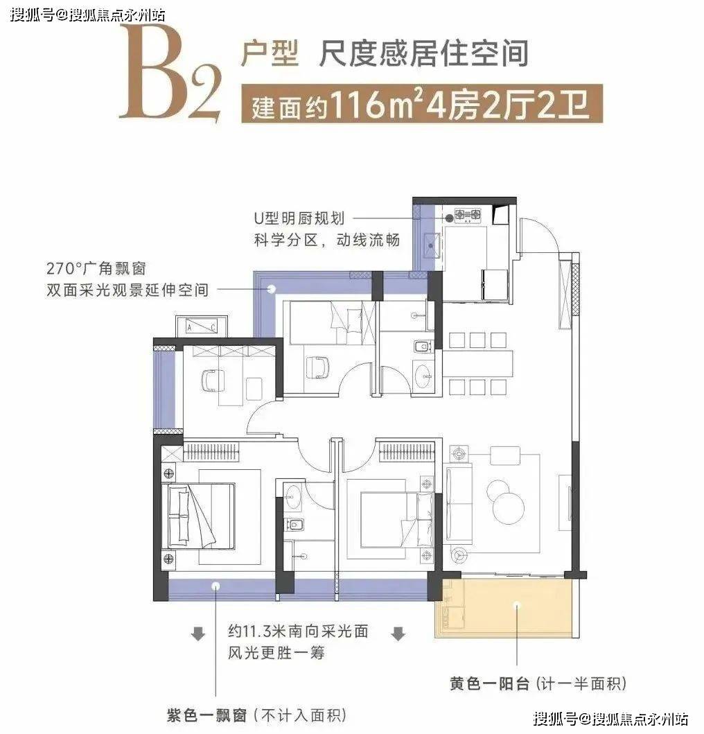 竖厅设计,空间平衡性好。小次卧采用L型飘窗设计,采光和视野更佳。U型明厨规划科学分区动线流畅。