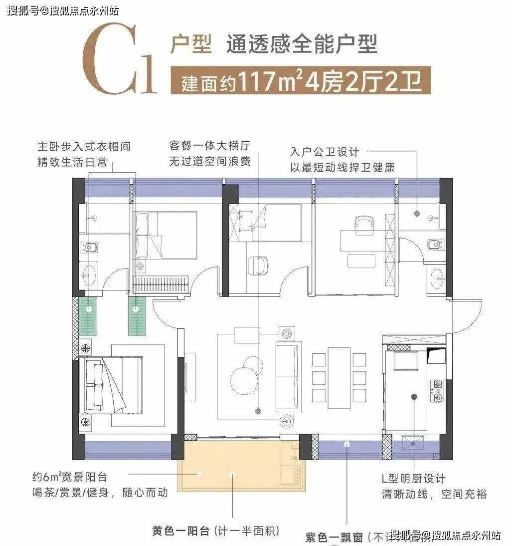 例如,建面约111㎡的四房户型,动静分区明确,餐客厅一体,阳台开间宽敞,主卧套房设计,带卫生间和衣帽间,实用性强。