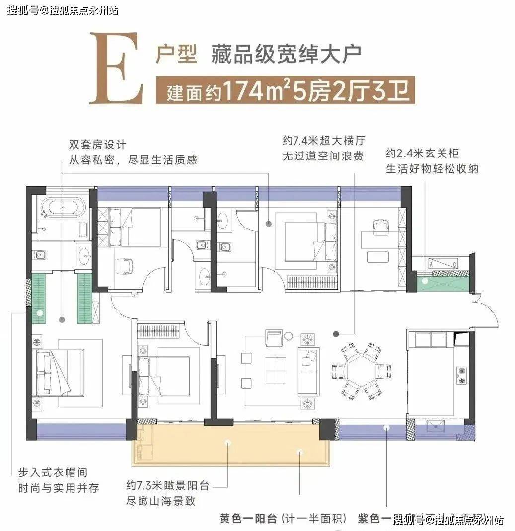 经典的竖厅格局动静分离。五房三卫设计满足大家庭居住需求。约7.4米超大横厅和7.3米瞰景大阳台打造舒适居住空间。