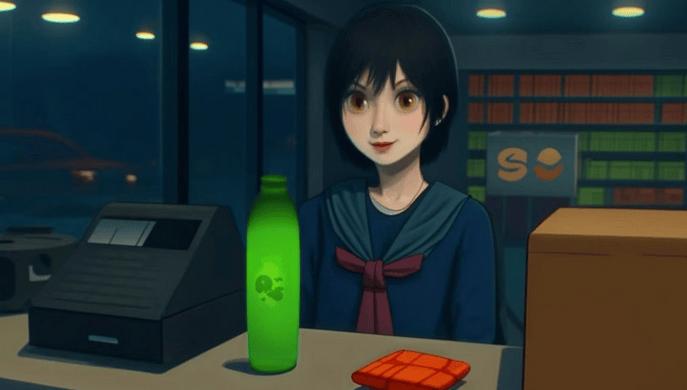 这款作品的 logo 明显是在 AI 工具中对《寂静岭f》标志进行简单仿制,商店页面的“截图”更是荒诞至极:两张从科乐美原作中截取的画面直接糊上手机 UI 界面,主角深水雏子的 AI 版本则被生硬放在加油站背景前,而画面前景居然出现类似“外星版激浪”的饮料瓶道具。